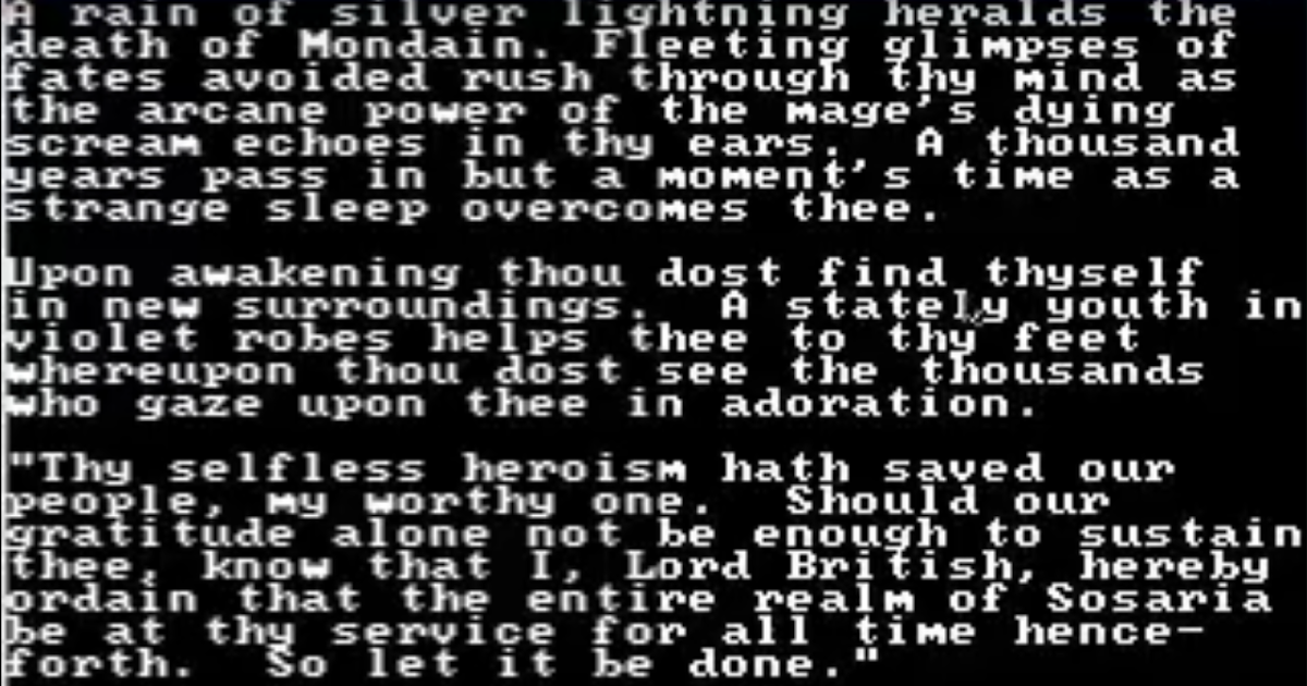 Прежде чем рассказать про все подробнее, хочу поделиться занятной ссылкой. В этом тексте пятнадцатилетней давности видный апологет Ultima пытается увязать все несостыковки первых частей сериала. В частности, куда делись другие расы (виновато уничтожение континентов и самоизоляция), откуда взялись шаттлы (Мондейн1 путешествовал в будущее и принес технологии с собой), и почему действие Ultima II происходит на Земле — но об этом как-нибудь потом.